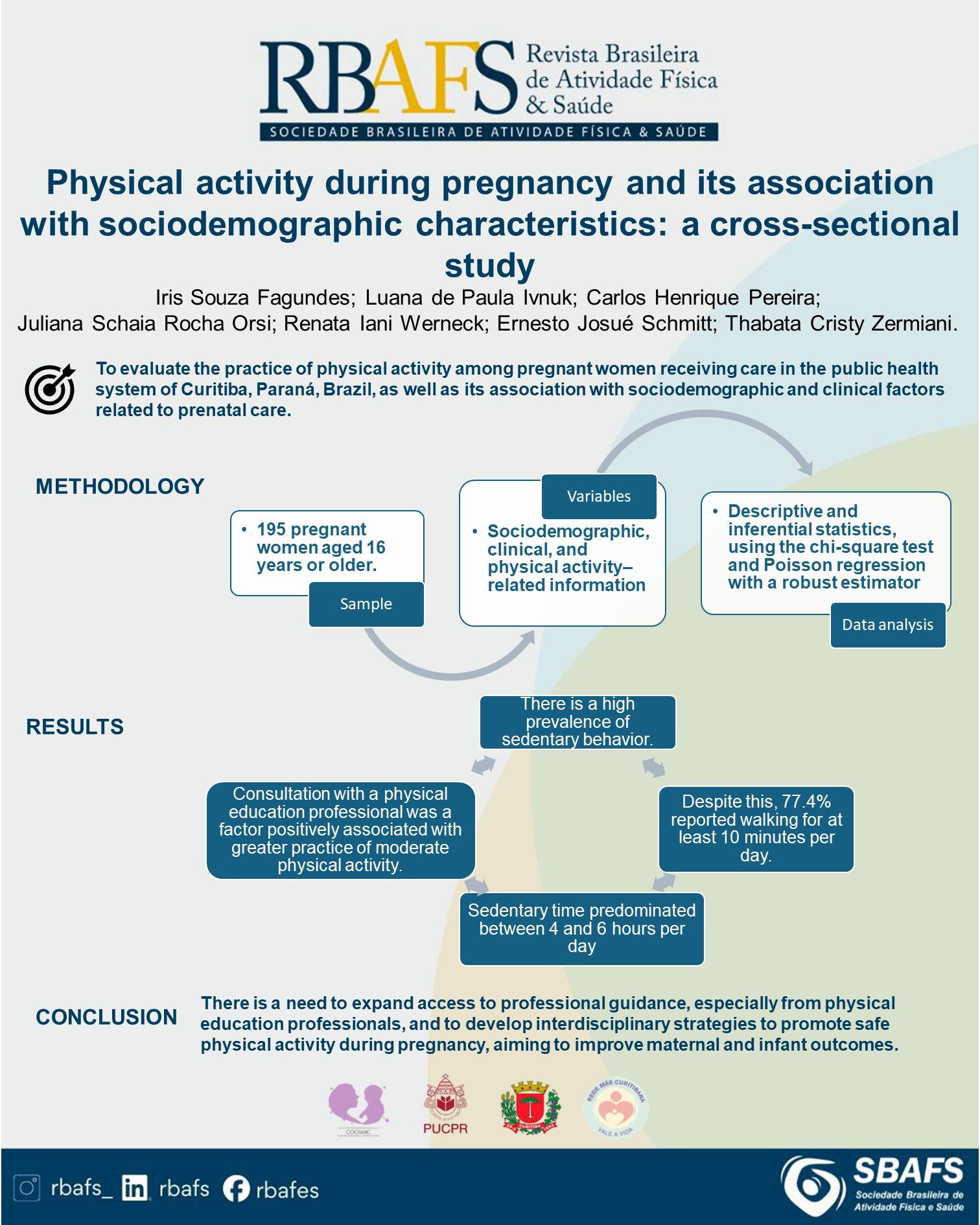 Introdução: A gestação representa um período de intensas mudanças físicas, emocionais e sociais, que requerem adaptações para garantir o bem-estar materno e fetal. Nesse contexto, a prática de atividade física (AF) pode contribuir para a prevenção de complicações gestacionais e para a promoção da saúde da gestante e do bebê. No entanto, a adesão a níveis adequados de AF durante a gestação permanece baixa. Objetivo: Avaliar a prática de AF entre gestantes atendidas na rede pública de saúde de Curitiba, Paraná, Brasil, bem como sua associação com fatores sociodemográficos e clínicos relacionados ao acompanhamento pré-natal. Métodos: Trata-se de um estudo transversal, vinculado à Coorte de Saúde Materno-Infantil de Curitiba, com participação de 195 gestantes com idade igual ou superior a 16 anos. Foram coletadas informações sociodemográficas, clínicas e relacionadas à prática de AF, analisadas por estatística descritiva e inferencial, utilizando teste Qui-quadrado e regressão de Poisson com estimador robusto. Resultados: Há elevada prevalência de inatividade física: 80,5% das gestantes não atingiram os 150 minutos semanais de AF moderada e 89,2% não realizaram atividades vigorosas por ao menos 10 minutos contínuos. Apesar disso, 77,4% relataram caminhar por pelo menos 10 minutos diários. O tempo sedentário predominou entre 4 a 6 horas diárias. A consulta com profissional de Educação Física foi um fator associado positivamente à maior prática de AF moderada. Conclusão: Há necessidade de ampliar o acesso à orientação profissional e desenvolver estratégias interdisciplinares para promoção da AF segura durante a gestação, visando melhores resultados materno-infantis.