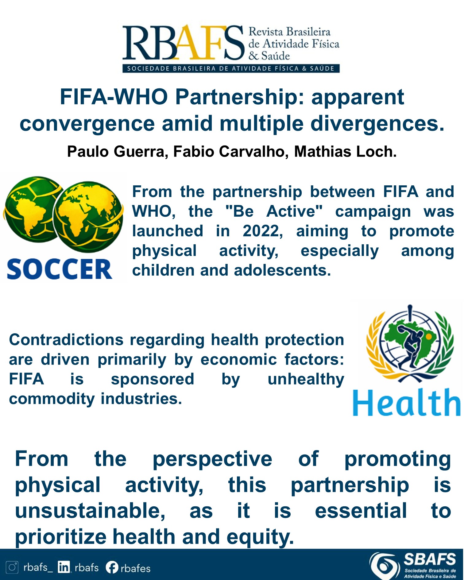 Da parceria entre a Federação Internacional de Futebol (FIFA) e a Organização Mundial da Saúde (OMS), em 2022, foi lançada a campanha Be Active (“Seja Ativo”), que busca incentivar a prática de atividades físicas, especialmente entre crianças e adolescentes. Mesmo que as instituições de grande porte tenham papel importante na disseminação de ações em saúde, o presente texto traz reflexões sobre as contradições quanto aos seus compromissos com a proteção à saúde, que são motivadas, sobretudo, por aspectos econômicos. A principal delas está no contraste entre as relações históricas entre a FIFA e as indústrias de commodities insalubres, que patrocinam seus megaeventos há mais de 50 anos e os esforços da OMS em recomendar a formulação de políticas mais assertivas para proteger crianças e adolescentes dos impactos do marketing alimentar, bem como seu apoio ao debate sobre os determinantes comerciais da saúde. O texto também traz reflexões sobre questões de outros domínios, como o étnico-racial e o político. Por fim, a partir destes pontos de contradição quanto aos compromissos da FIFA e da OMS em relação a proteção à saúde, que são permeadas, sobretudo, por prerrogativas econômicas, cabe indicar, sob o enfoque da promoção da atividade física, e, por consequência, da saúde, que esta parceria não se sustenta, recomendando-se que a OMS se afaste de entidades que, em suas práticas, não prezam pela saúde e equidade.